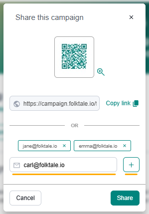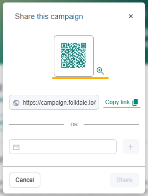 Click the Share button below your campaign banner, and a pop-up window will appear showing all the available sharing methods.