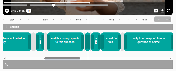 - A timeline of subtitles will open beneath the video player, ready to be edited. You can scroll left and right to explore the timeline as well as zoom in and out with the - and + buttons.