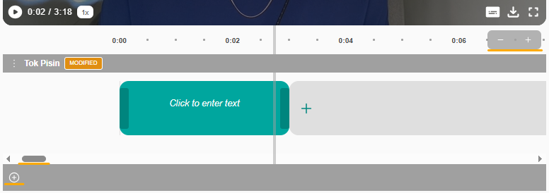 - Once done, a timeline of subtitles will open beneath the video player ready to be edited. You can scroll left and right to explore the timeline as well as zoom in and out with the - and + icons above. Additionally, you can also add a new track by pressing the plus button below.